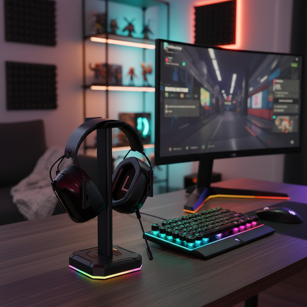 Alliage premium, éclairage RGB hypnotique, stabilité professionnelle. Organisez votre bureau gaming avec style et protégez votre casque.